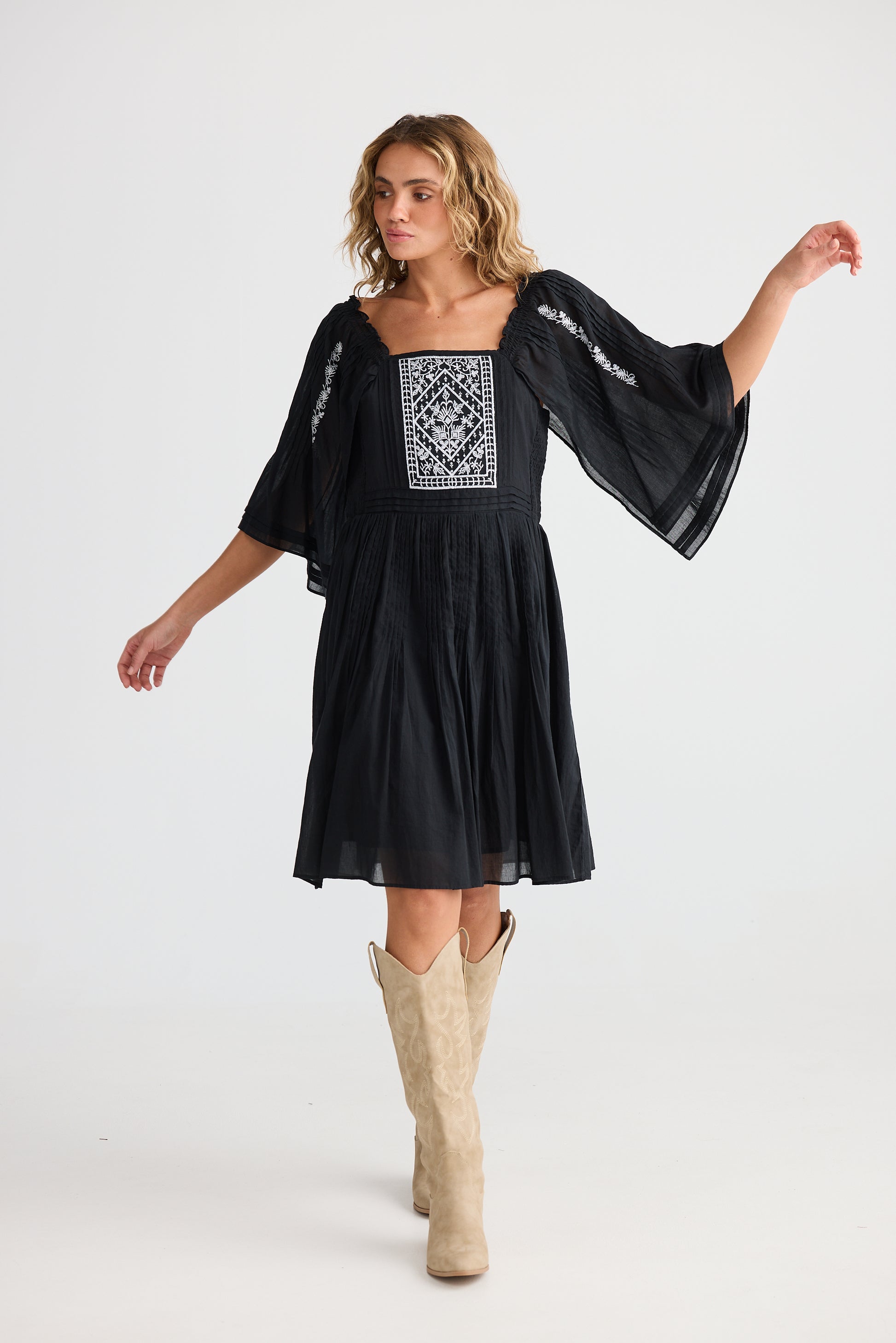 The Ballina Dress by Talisman brings effortless femininity with its floaty silhouette and beautifully contrasted white embroidery. Featuring a square neckline and soft cape sleeves with shirred shoulder detailing, it blends structure with movement. Pintuck detailing along the sleeves, bodice and skirt adds texture, while the shirred side panels ensure a comfortable, flattering fit. Fully lined and designed in a chic mini length, this black embroidered dress is the perfect blend of boho charm and modern ease.