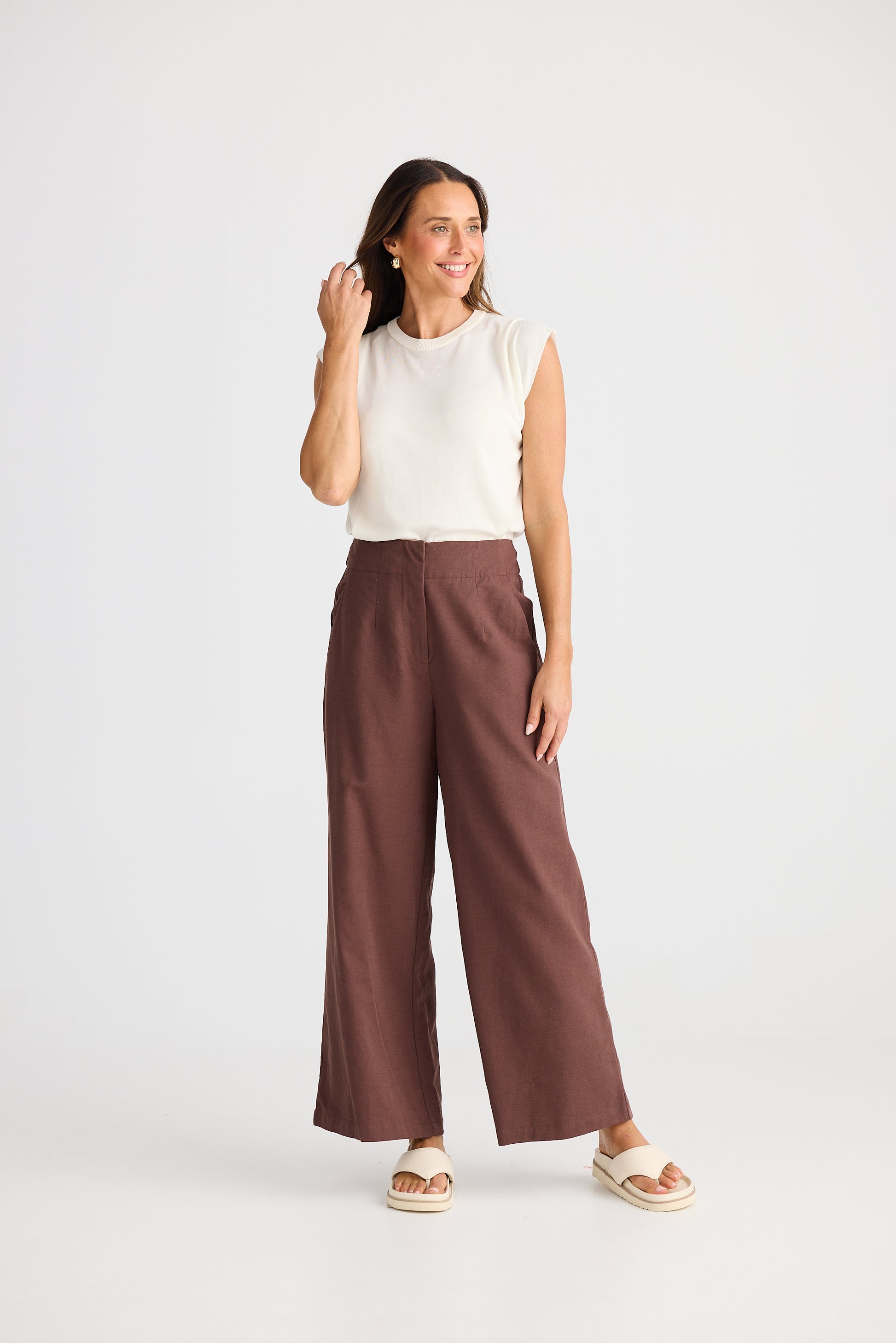 Effortlessly elegant and endlessly wearable, the Dover Pants in Chocolate by Brave + True are a timeless addition to your wardrobe. Designed to sit comfortably at the natural waist, these full-length pants feature a classic fly front opening and flattering wide-leg silhouette. Cutaway pockets add a touch of practicality without compromising on style. Whether you're dressing them up for work or pairing them with a tee for the weekend, the Dover Pants offer refined comfort with every wear.