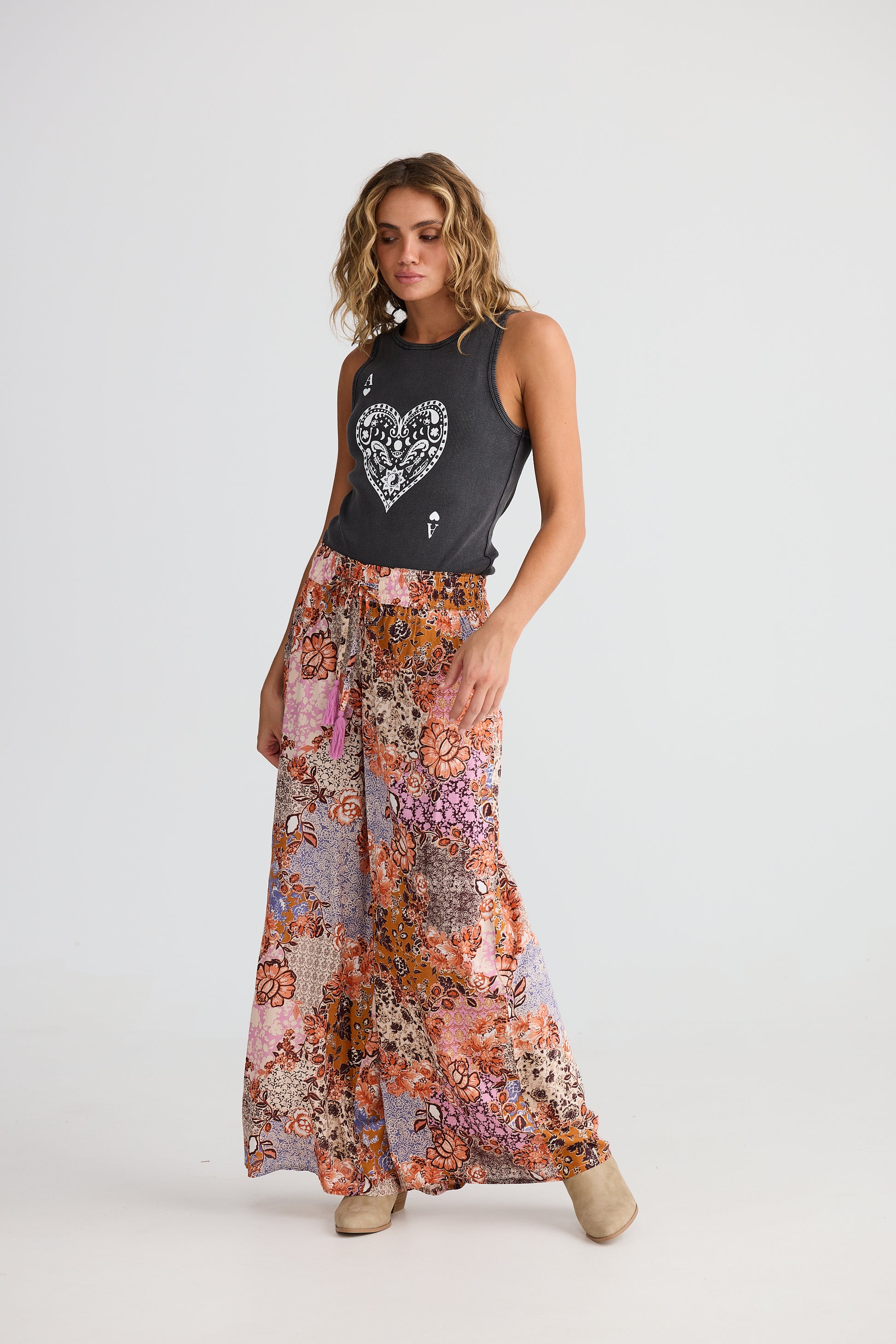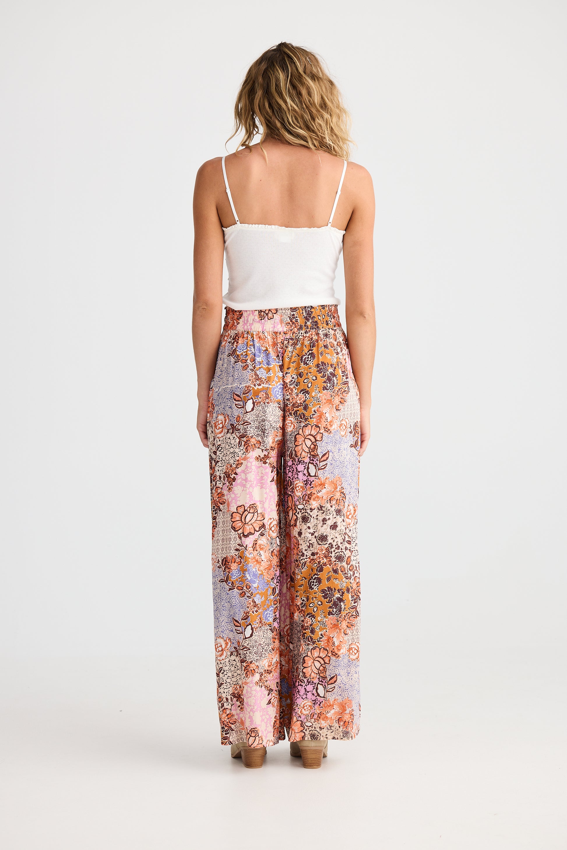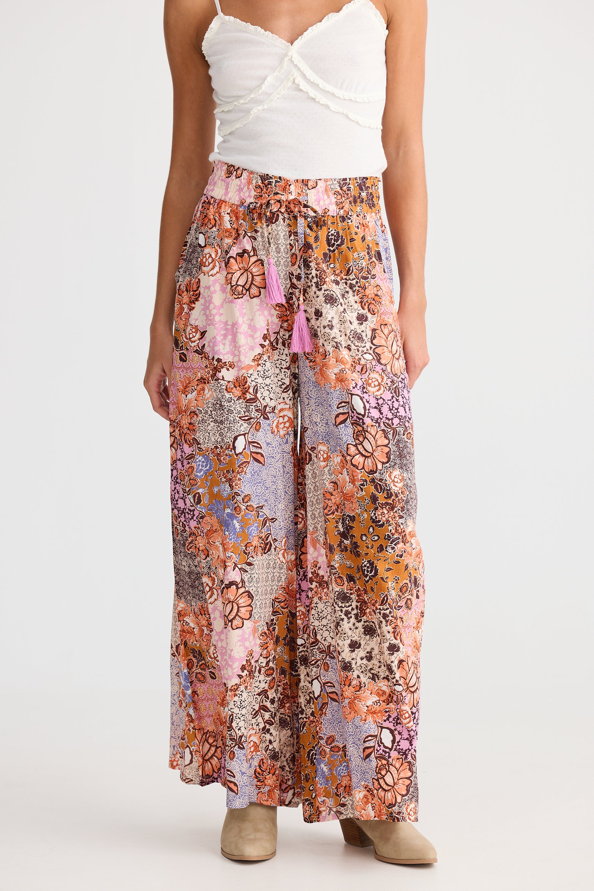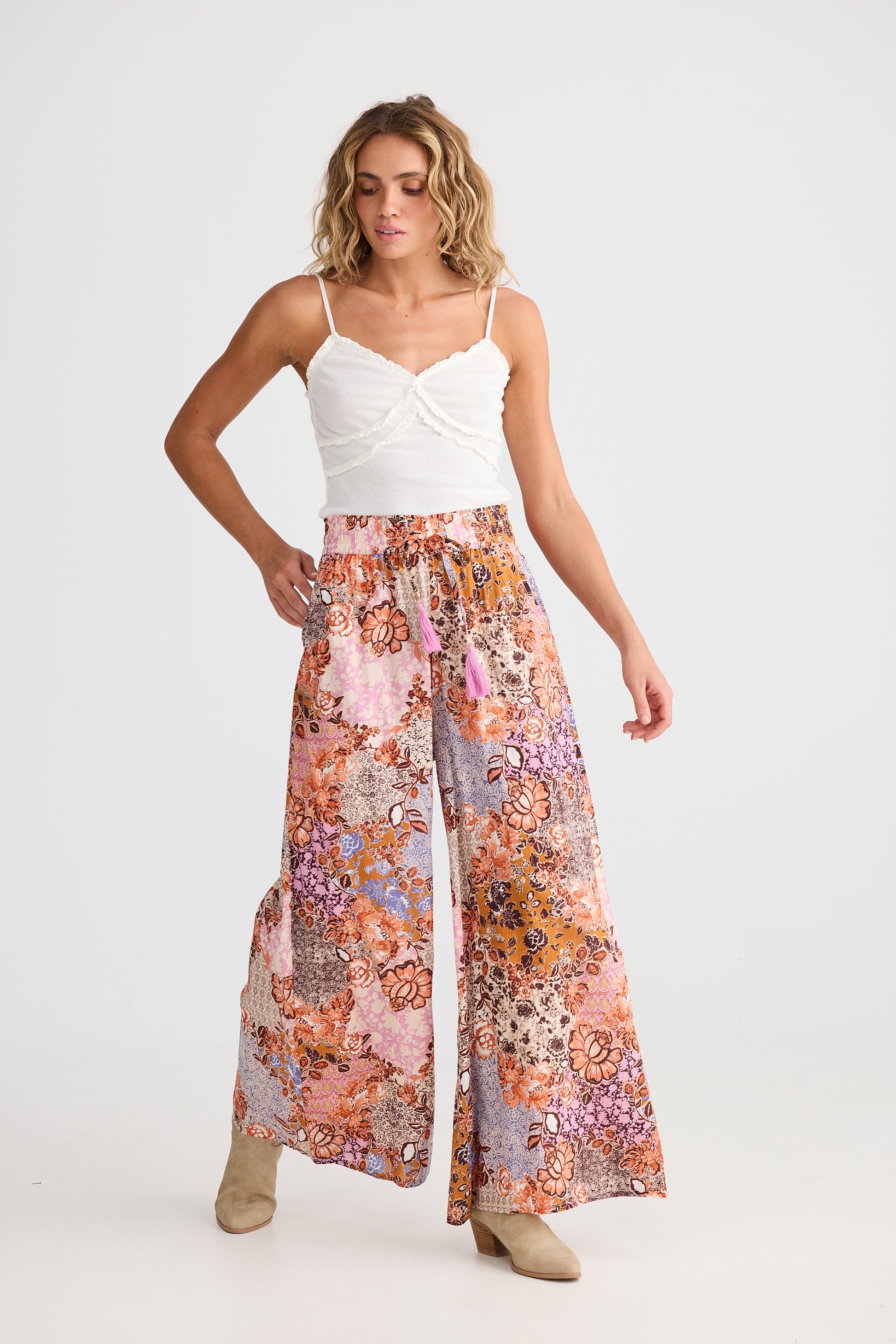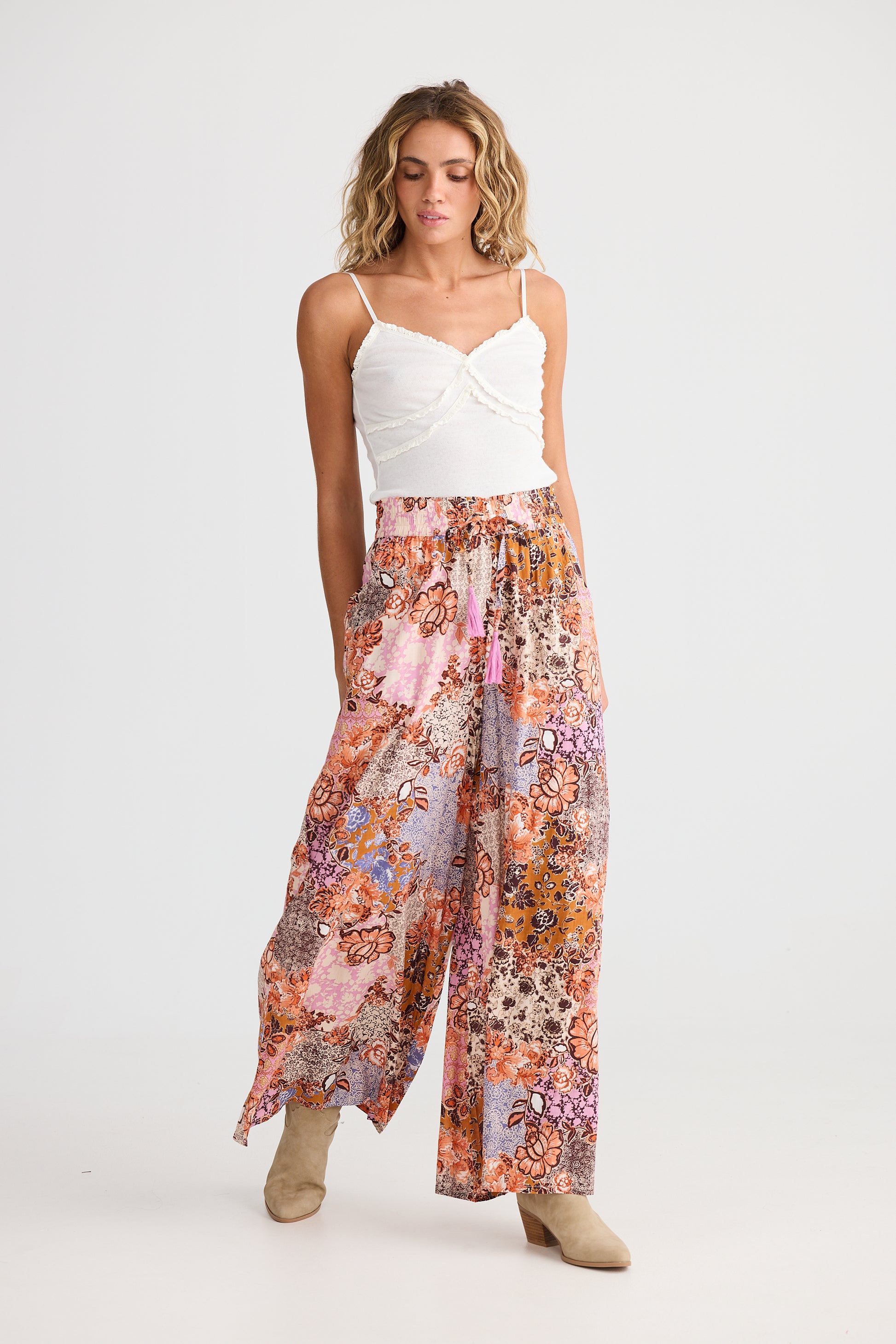 Embrace laid-back luxury with the Freedom Pants in Dream Weaver. Designed for sun-drenched days and carefree adventures, these wide-leg pants feature a vibrant patchwork of floral prints in earthy orange, blush pink, soft lilac, and deep cocoa tones. Crafted from lightweight, breathable fabric, they offer effortless movement and all-day comfort. The high-waisted silhouette, adjustable self-tie belt, and practical pockets make them as functional as they are fabulous. Whether you're strolling the beach or styling them for a summer soirée, the Freedom Pants are your go-to for bohemian elegance.