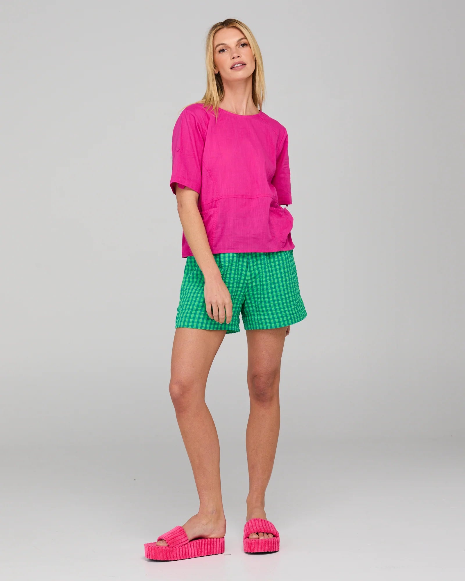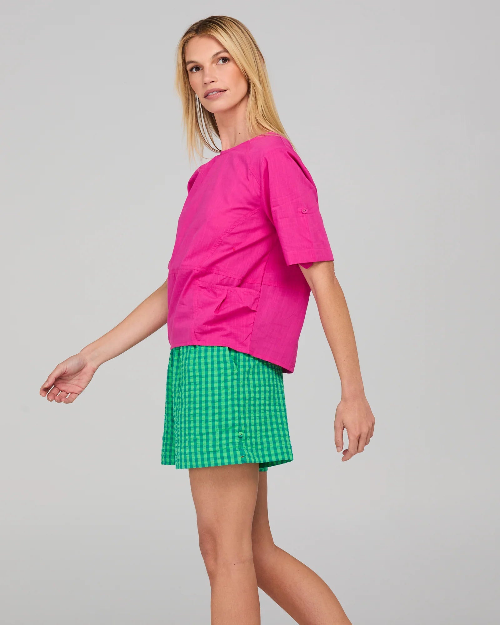 100% cotton, short sleeves, button tab on sleeve to wear rolled up or rolled down, button closure at back neckline, two front pockets with pleat detail, seam and panel detail for signature Guru look, high scooped neckline, unlined.