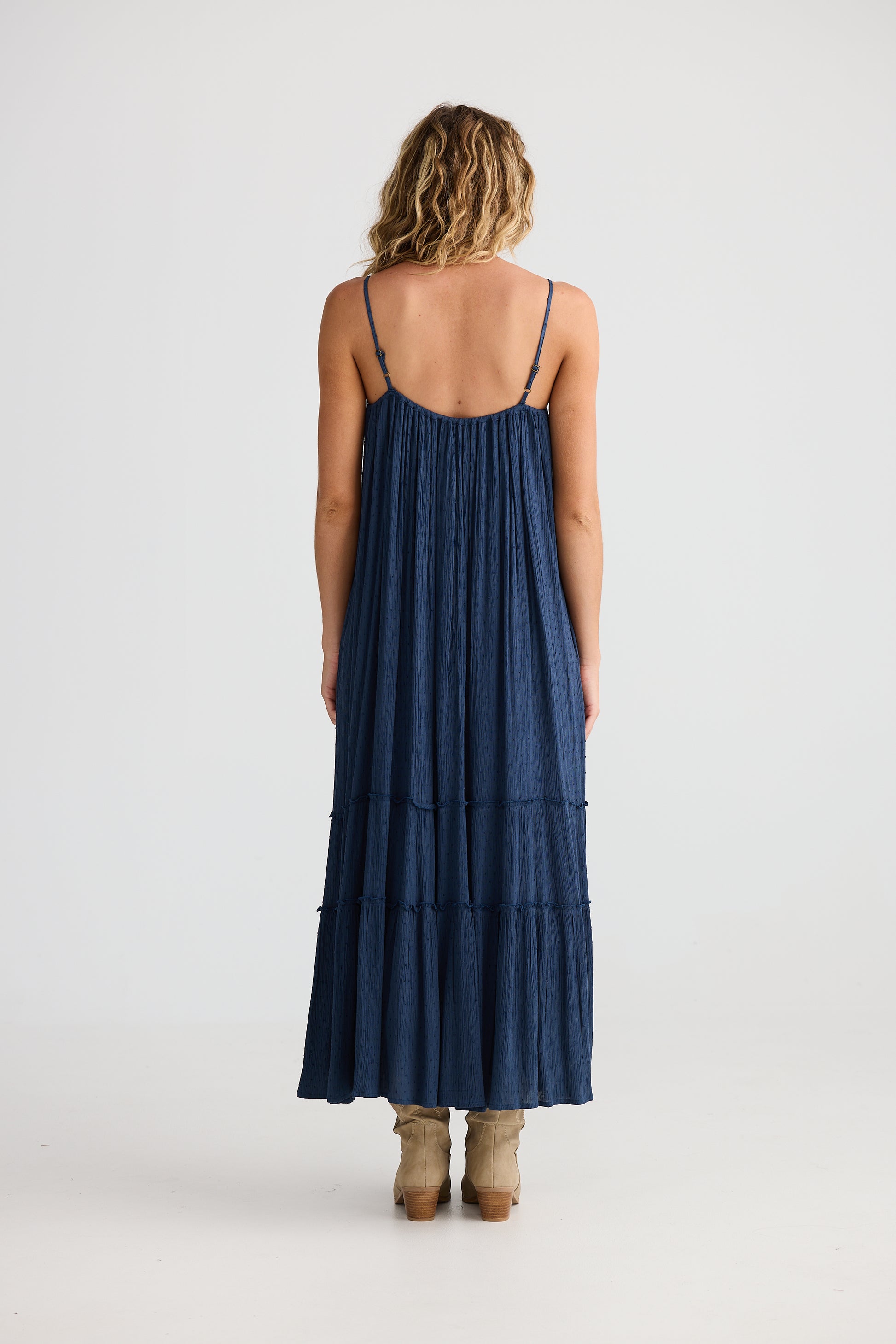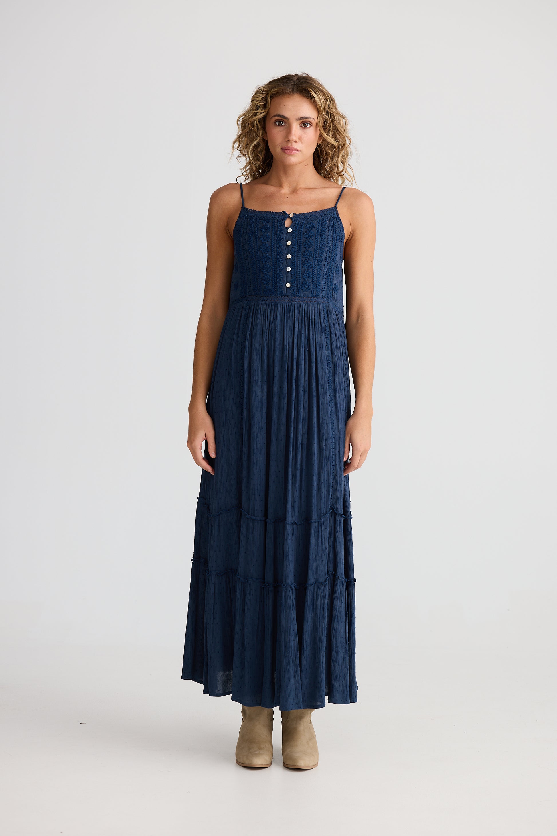 The Inhale Dress in Navy Dobby by Talisman is the kind of piece you’ll reach for time and time again. Crafted from soft, textured viscose with a relaxed fit, this effortlessly feminine midi dress features delicate lace trim along the bodice and skirt for a touch of vintage charm. Mother-of-pearl buttons add a subtle shine, while the elasticated back ensures all-day comfort. A dreamy silhouette for weekend wandering, long lunches, or spontaneous getaways.