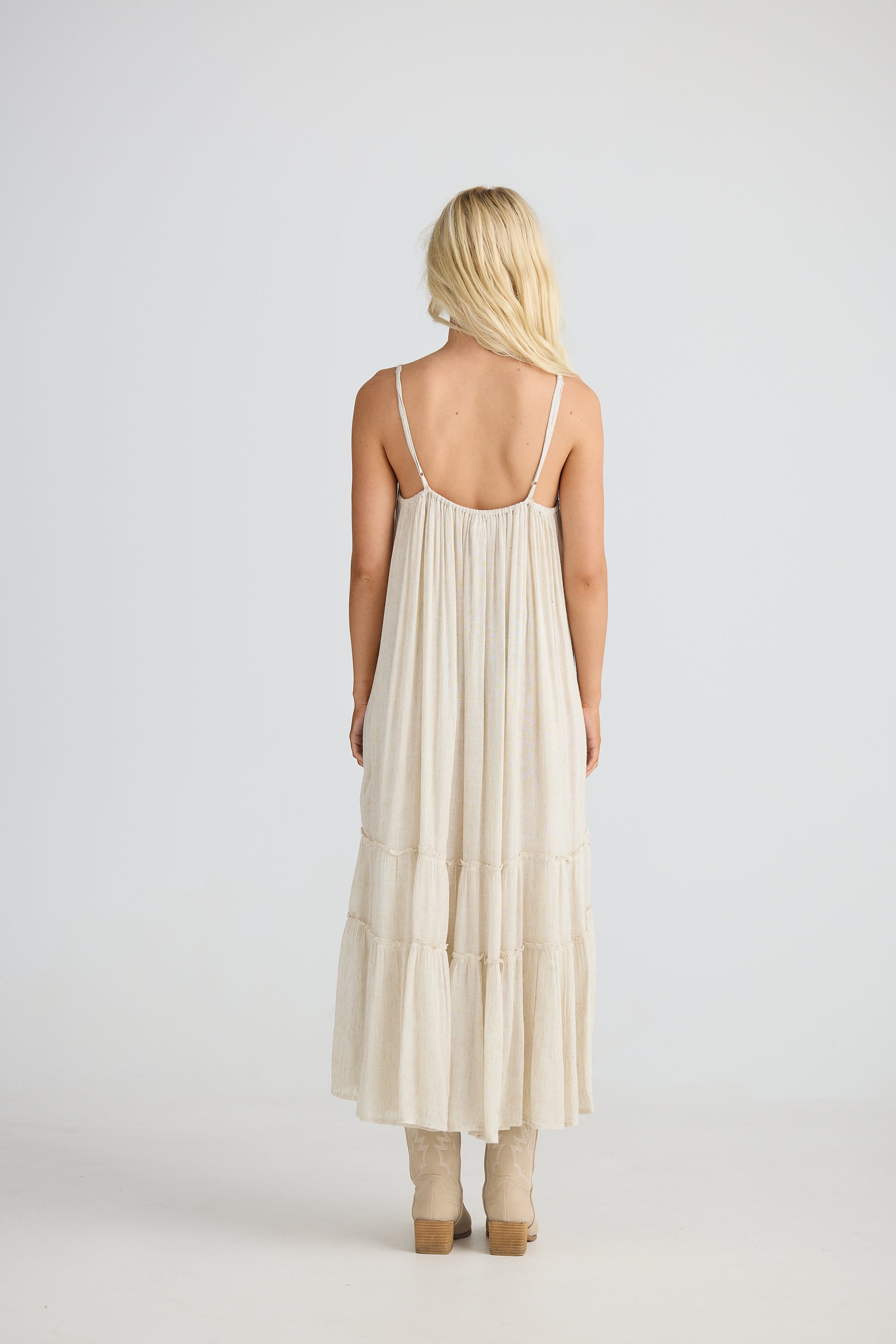 Introducing the Ithika Strappy Dress in Light Natural — a boho-inspired maxi dress designed to capture effortless elegance and sun-soaked style. Crafted from a soft viscose-linen blend with 100% cotton lining for breathable comfort, this dress features adjustable spaghetti straps for a custom fit and a relaxed, flowing silhouette that moves beautifully from day to night.