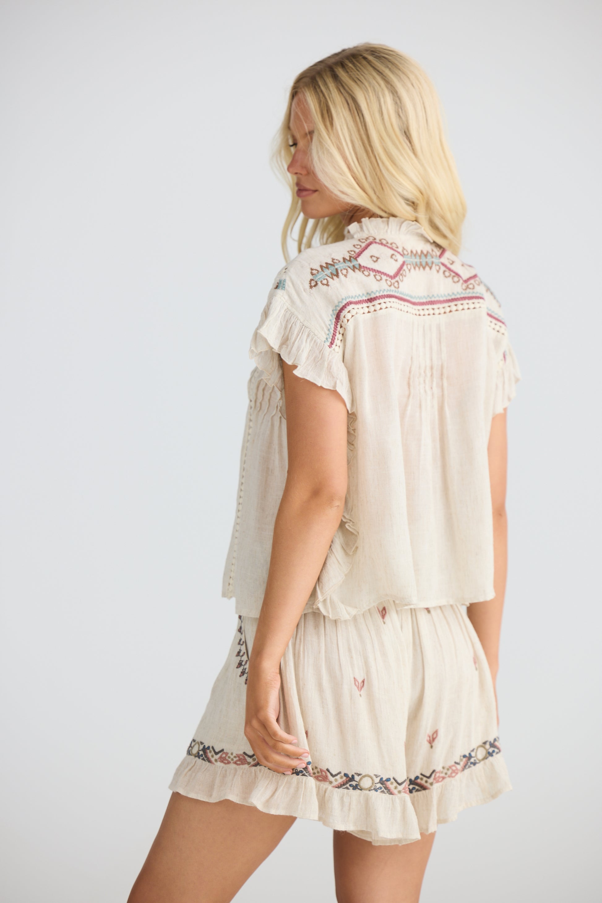 Elevate your wardrobe with the effortlessly chic Ithika Tie Top in Light Natural — a must-have piece from Talisman that blends boho charm with everyday elegance. Crafted in a soft and breathable viscose-linen blend for all-day comfort, this relaxed-fit top features a flattering V-neckline with decorative frills and playful tassels, delicate embroidery along the front and back yoke, and subtle pintuck detailing for a refined finish.