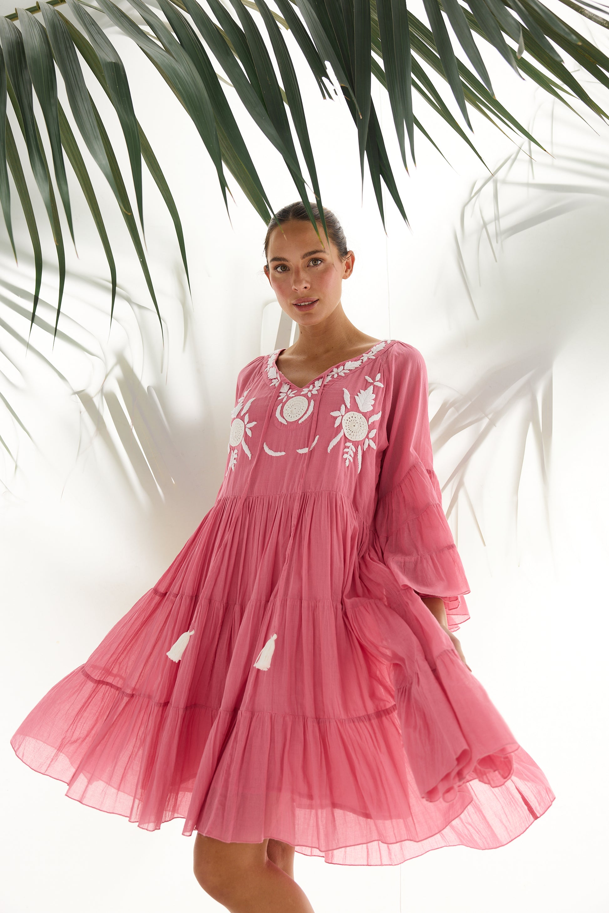 Step into effortless charm with the Jamaica Dress by Holiday Trading. In a soft Cosmo pink hue adorned with crisp white embroidery, this knee-length dress is crafted from lightweight 100% cotton voile—breathable, delicate, and perfect for warm days.