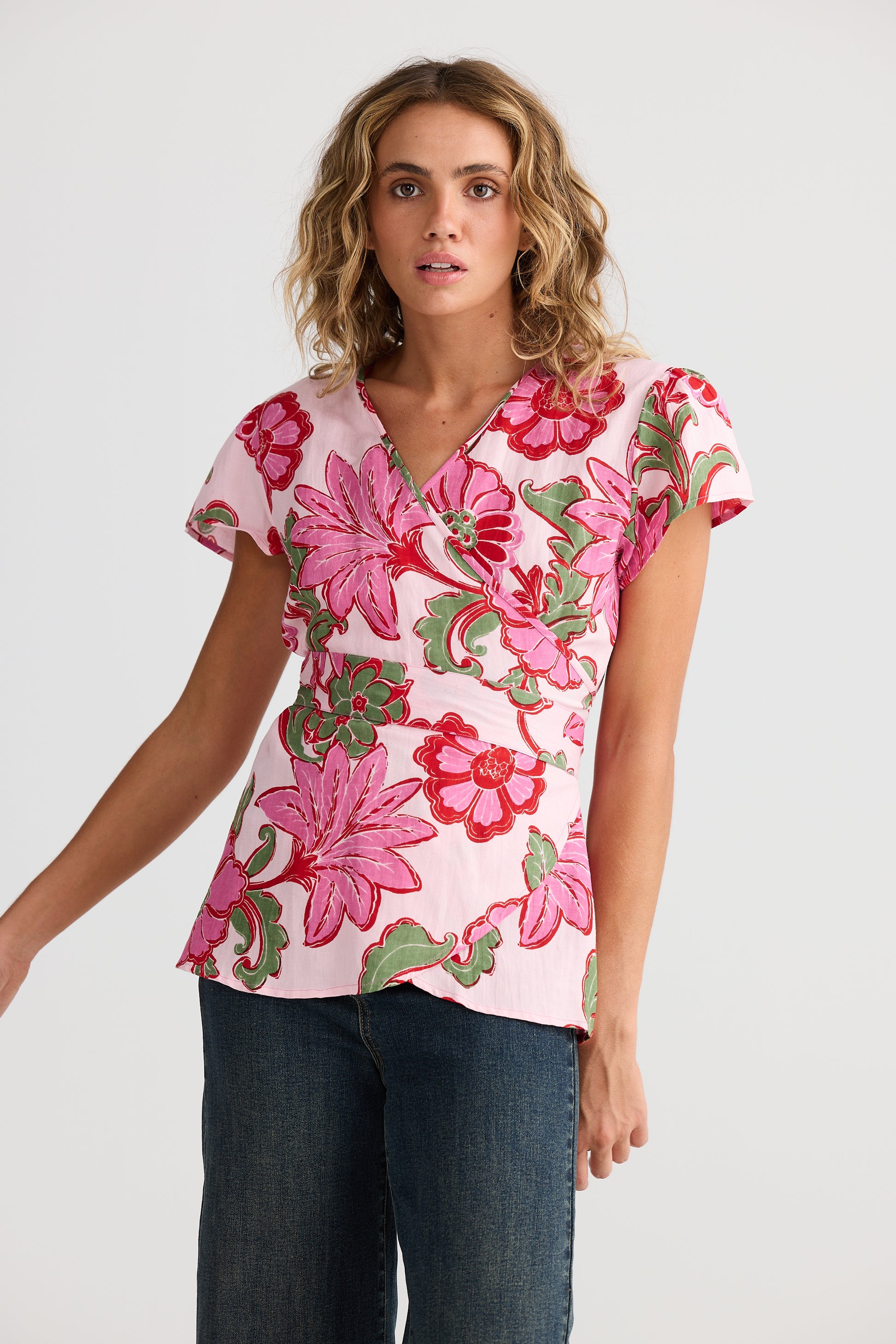 Bright, bold, and beautifully boho — the Lottie Wrap Top in Pink Ibiza by Talisman brings effortless charm to your everyday wardrobe. Featuring a soft wrap silhouette that ties at the waist, this flattering top showcases an eye-catching hand-drawn floral print in vivid shades of pink, green, and red. With its short sleeves and lightweight feel, it’s perfect for warm days, beachside escapes, or layered under a jacket for cooler evenings. Feminine yet relaxed, the Lottie is your new go-to statement piece.