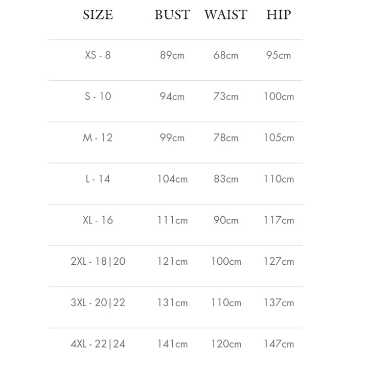 XS/8, S/10, M/12, L/14, XL/16, 2XL/18-20