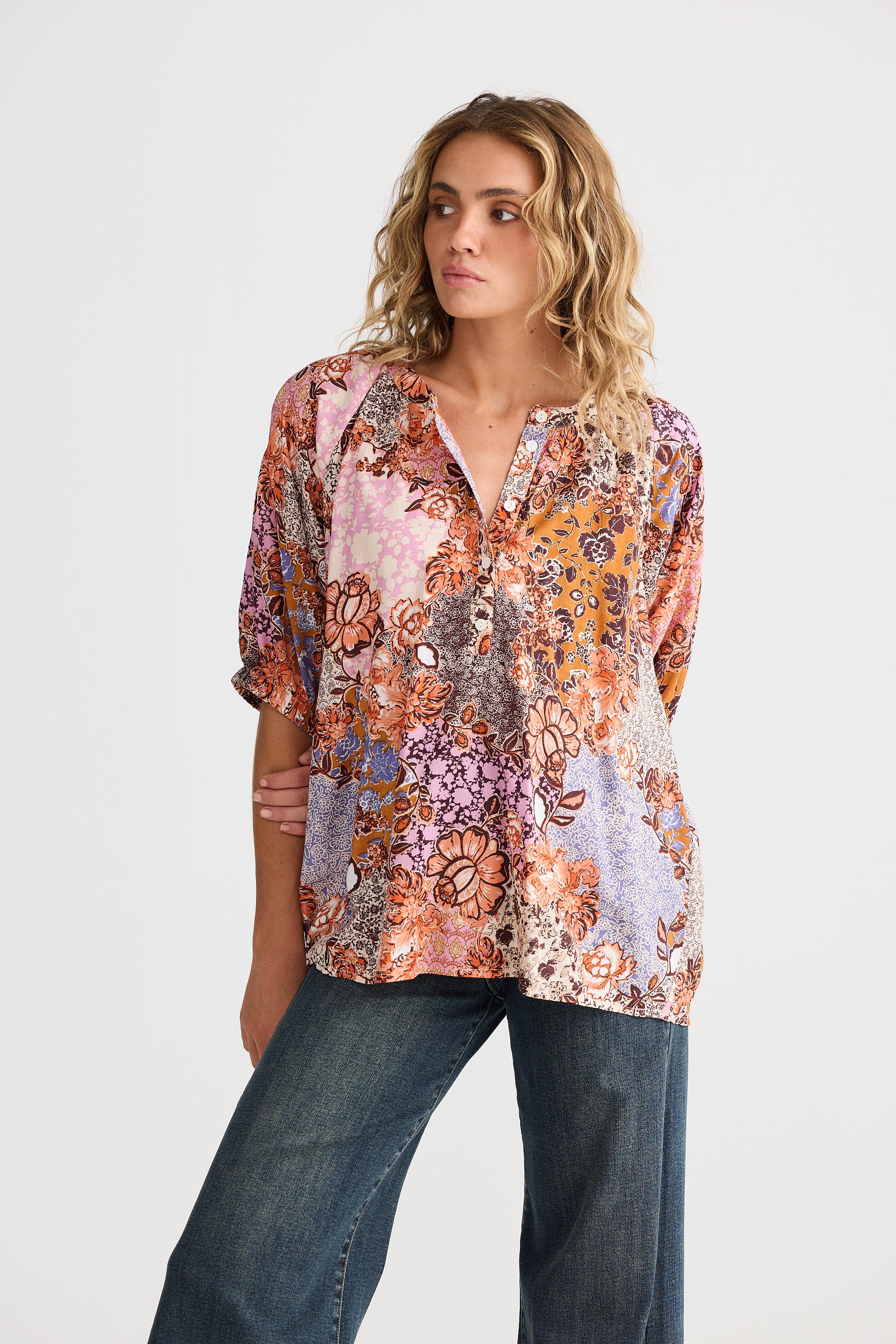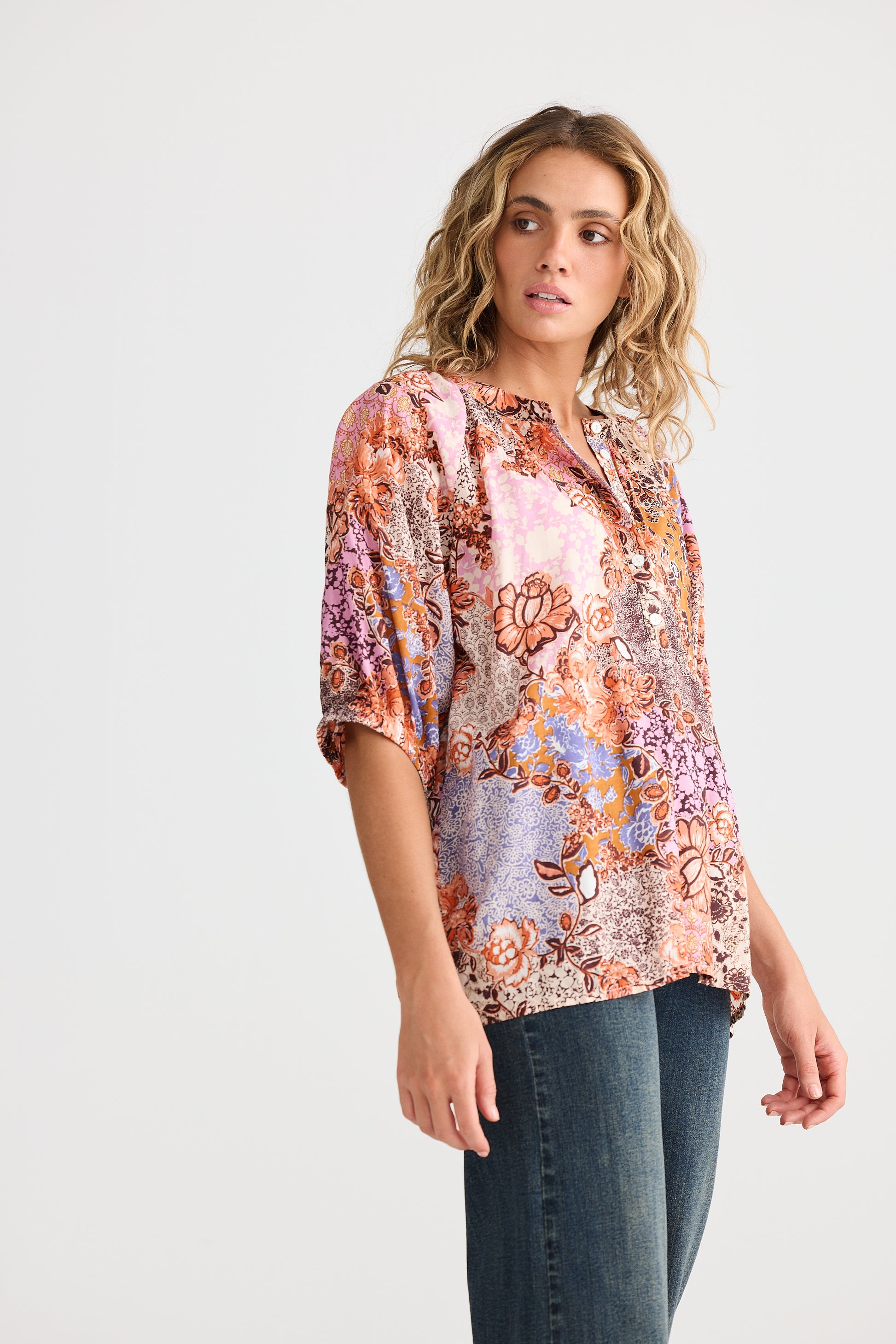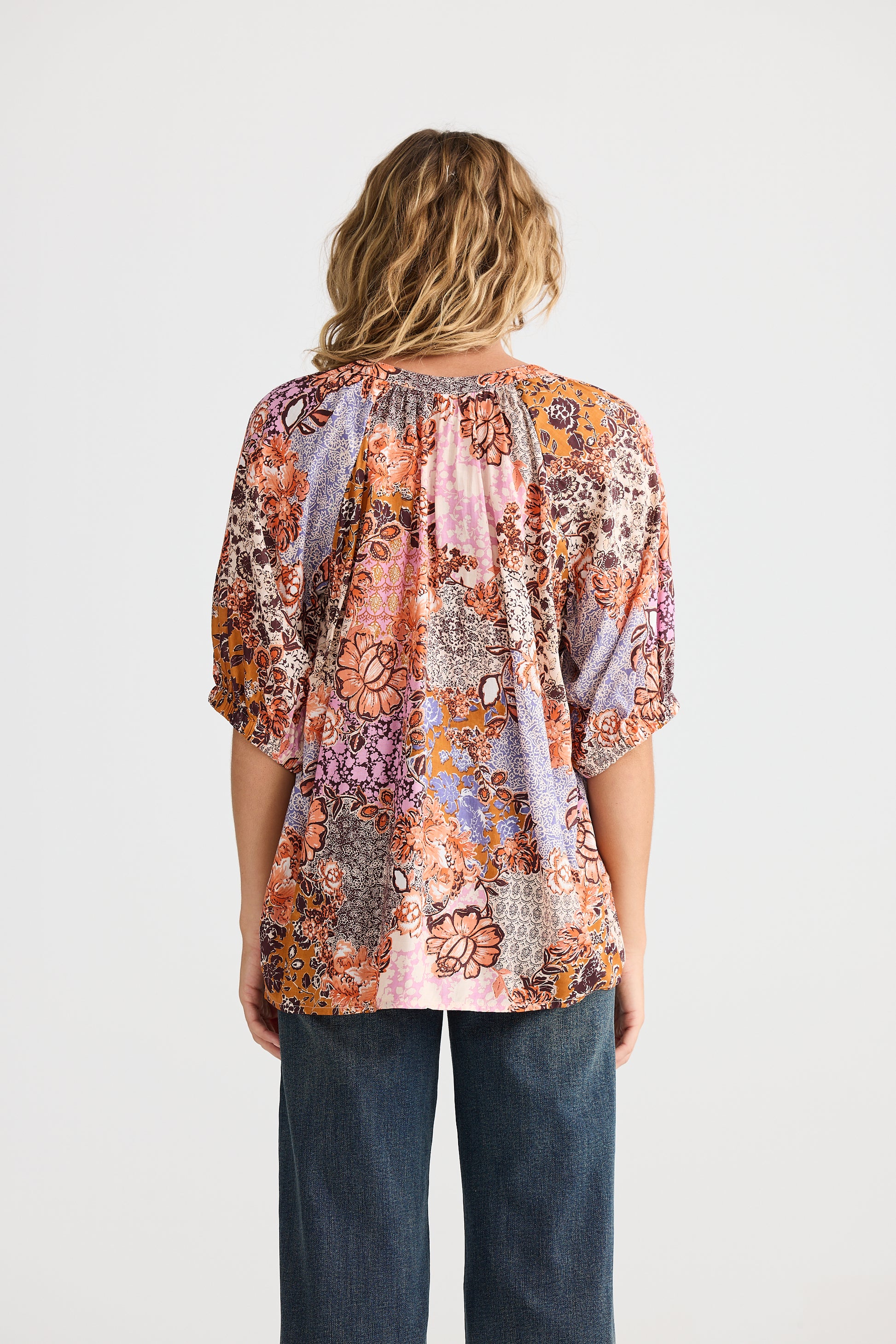 Effortless and feminine, the Rodeo Top in Dream Weaver brings a relaxed sophistication to your everyday wardrobe. Featuring a round neckline with a soft band collar and a flattering A-line shape, this blouse drapes beautifully with mid-length elasticated sleeves for added comfort and ease. The standout Dream Weaver print—a patchwork of soft pinks, earthy oranges, and romantic florals—adds a touch of bohemian flair to any look. Pair it with jeans for a casual day out or dress it up with a maxi skirt for a breezy, boho-chic vibe.