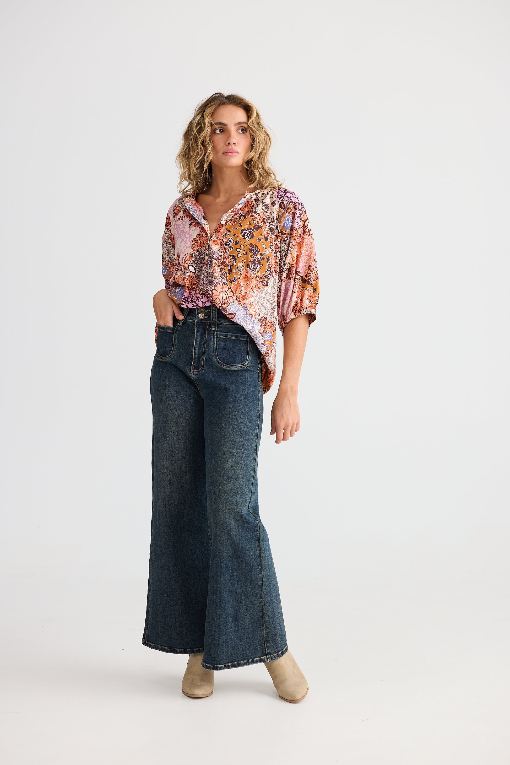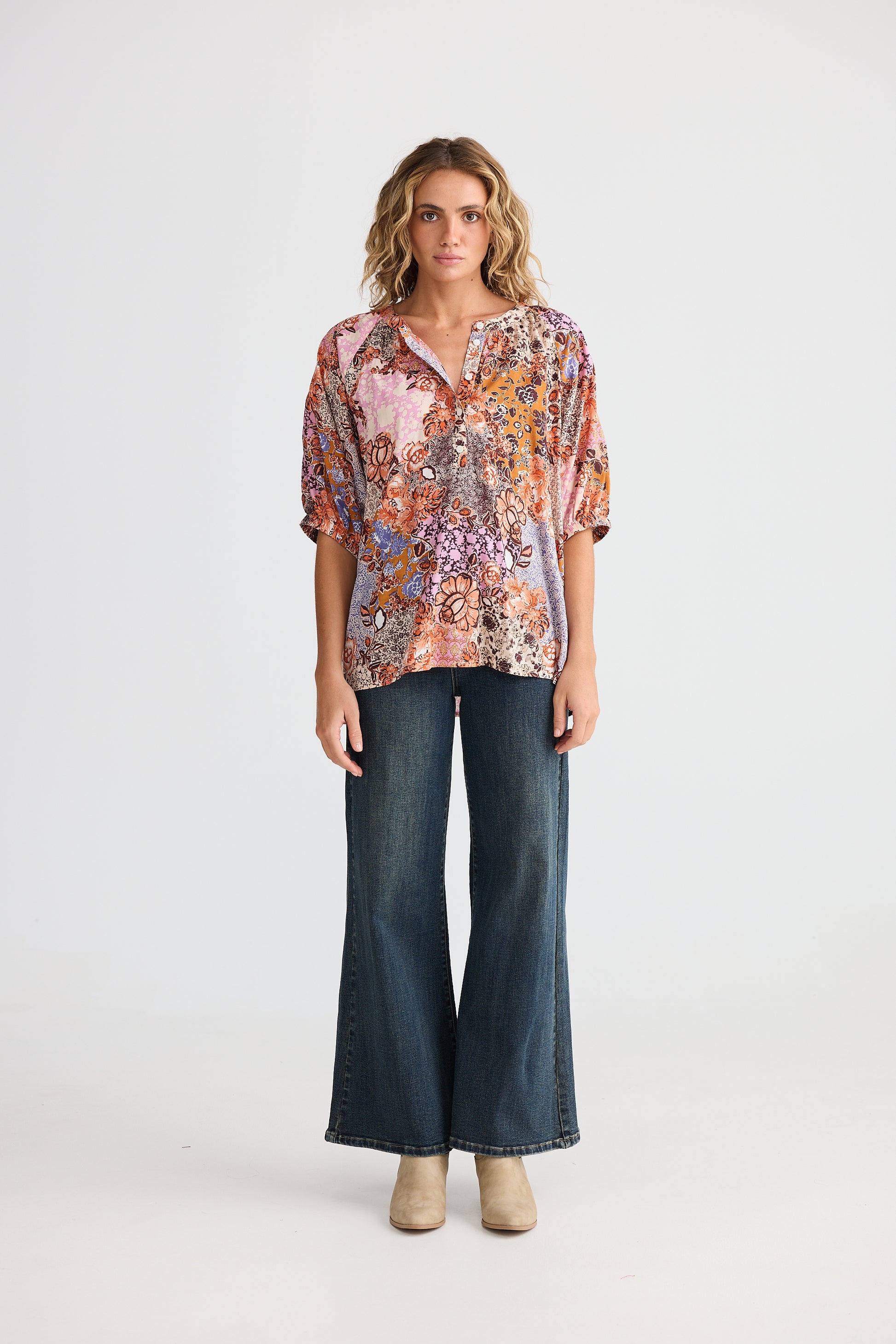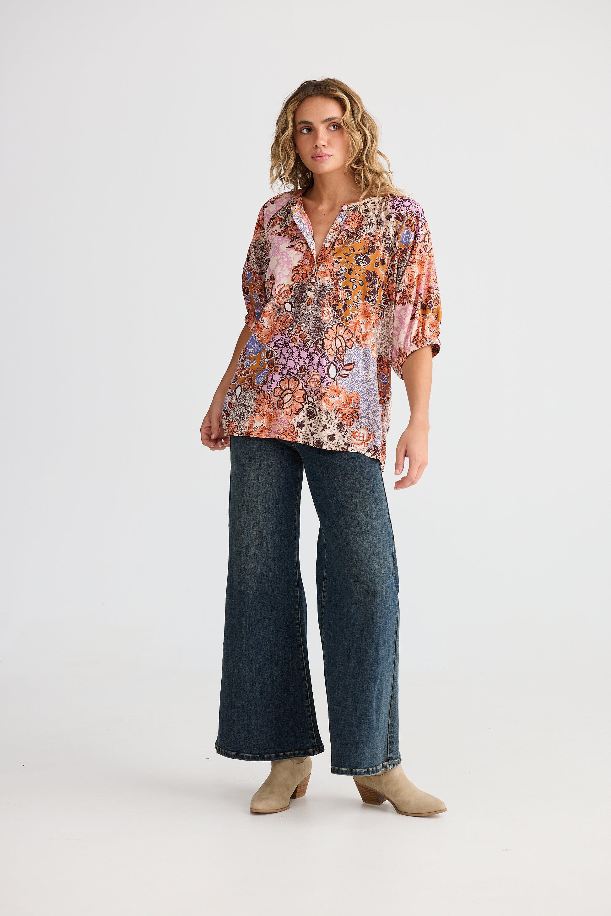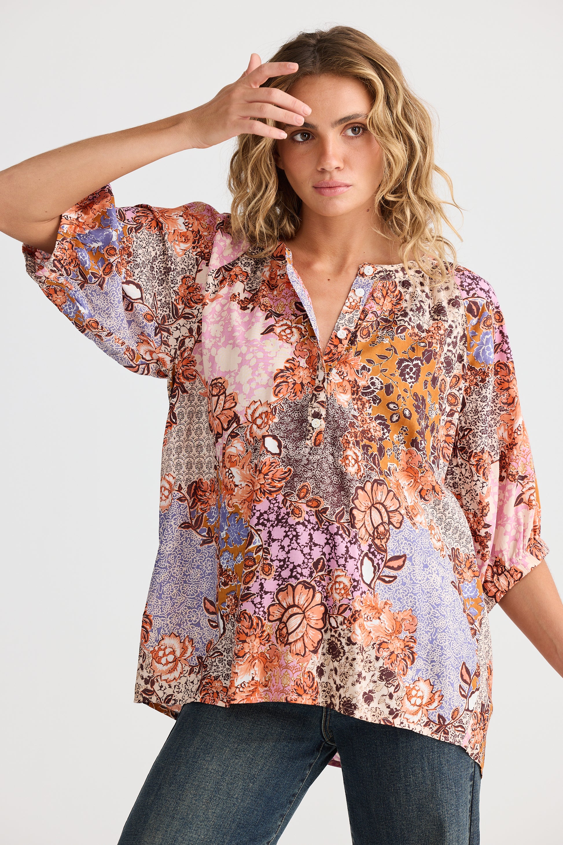 Effortless and feminine, the Rodeo Top in Dream Weaver brings a relaxed sophistication to your everyday wardrobe. Featuring a round neckline with a soft band collar and a flattering A-line shape, this blouse drapes beautifully with mid-length elasticated sleeves for added comfort and ease. The standout Dream Weaver print—a patchwork of soft pinks, earthy oranges, and romantic florals—adds a touch of bohemian flair to any look. Pair it with jeans for a casual day out or dress it up with a maxi skirt for a breezy, boho-chic vibe.
