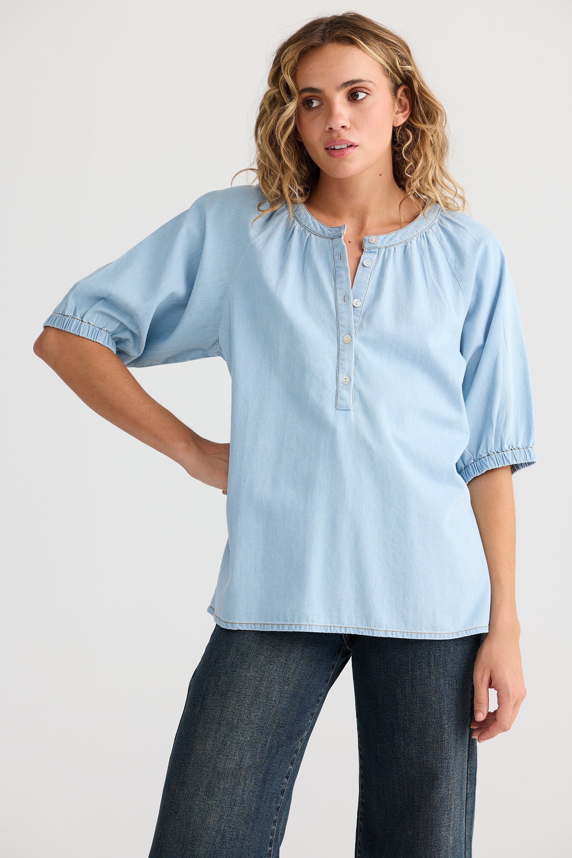 Discover that perfect blend of casual elegance and subtle Western spirit with the Talisman Rodeo Top in Light Denim. Crafted from soft, 100% cotton light denim, this top features a gently gathered round neckline with a refined band collar and a delicate keyhole button opening. Its flattering A-line silhouette flows effortlessly, while the mid-length elasticated sleeves create a softly voluminous, comfortable shape—ideal for everyday wear. Whether paired with your favourite denim for a classic double-denim look or dressed up with tailored pants, it's a versatile wardrobe staple that brings easy going sophistication to any outfit.