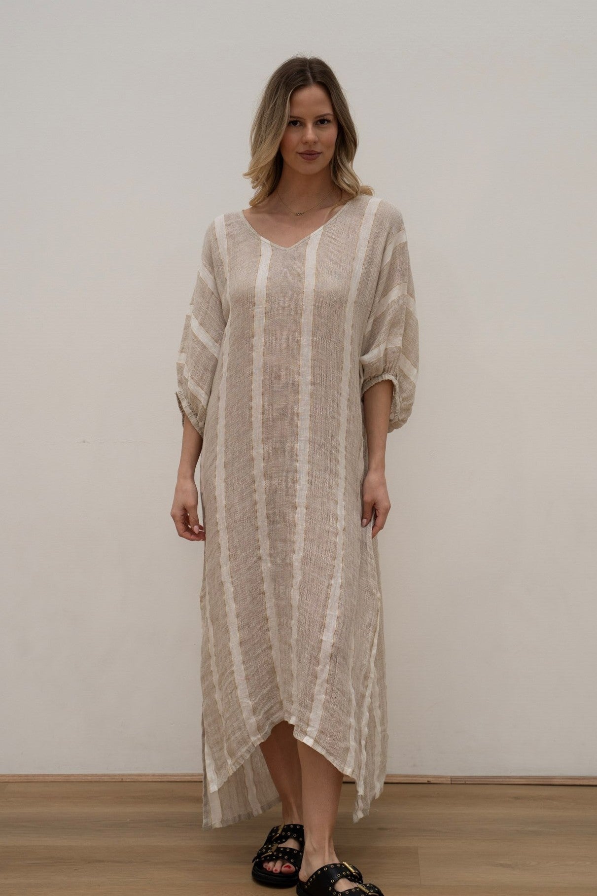 The soft natural and white base is enhanced by delicate gold stripe detailing, adding a refined, luminous finish without overpowering the design. Featuring a flattering V-neckline and gently elasticated sleeves, the Rosa Kaftan drapes beautifully for a relaxed yet polished silhouette.