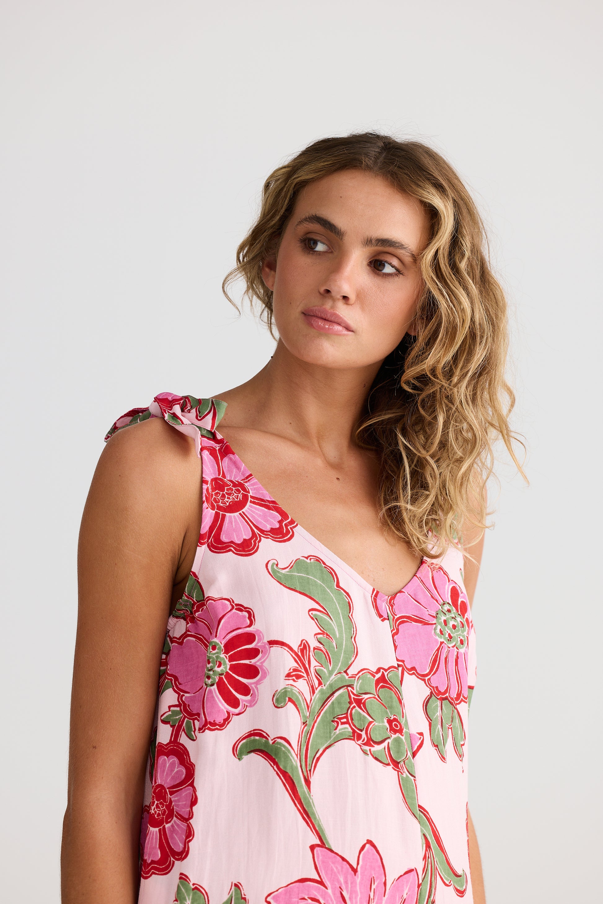 Make a bold statement in the effortlessly chic Temple Jumpsuit in Pink Ibiza by Talisman. Designed for the free-spirited woman, this wide-leg jumpsuit features a relaxed silhouette with a flattering scoop neckline and adjustable tie-up shoulder straps for a customizable fit. Crafted from lightweight, breathable fabric, it showcases a vibrant hand-drawn floral print in shades of pink and red with leafy green accents – perfect for warm-weather adventures or slow weekends at home.