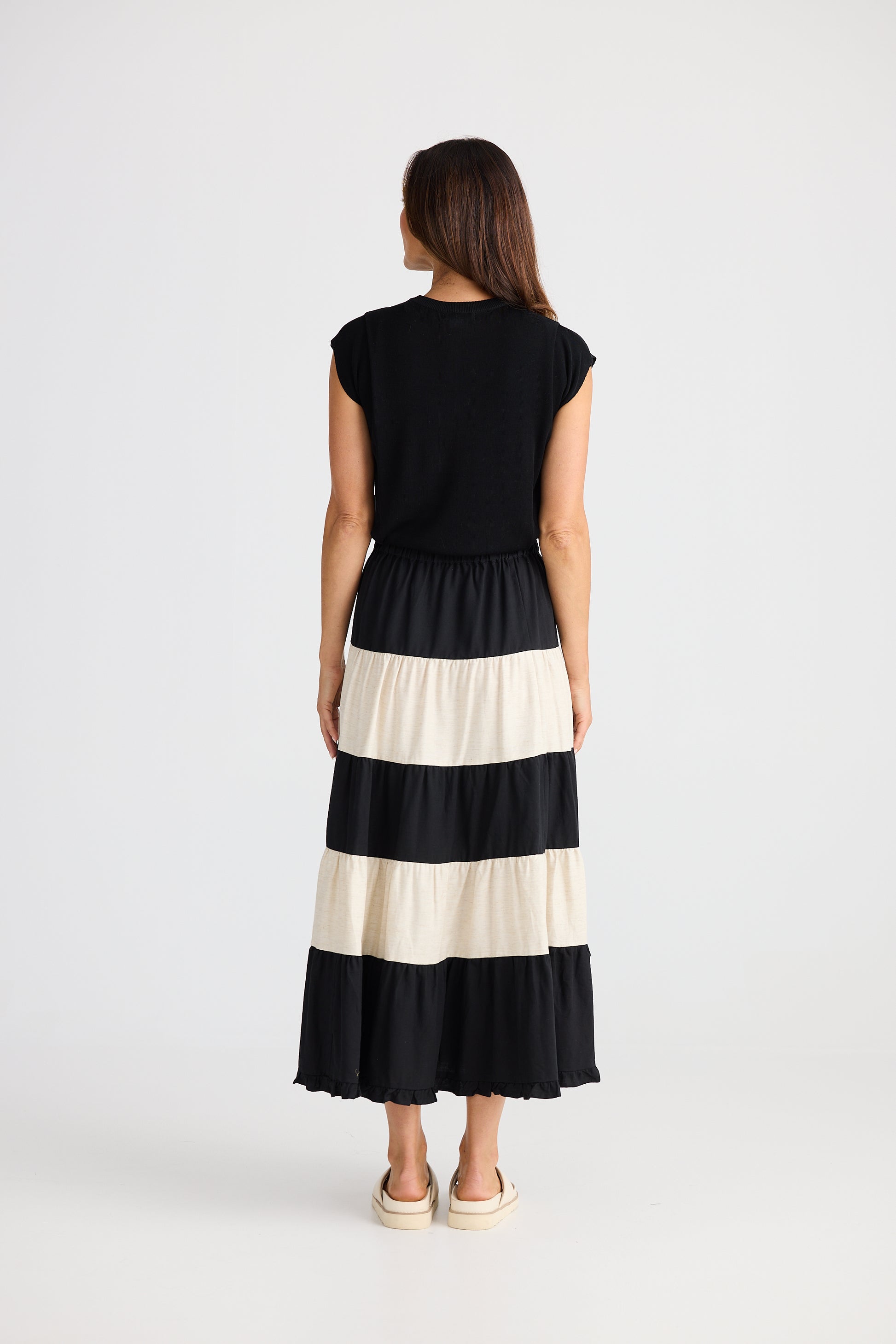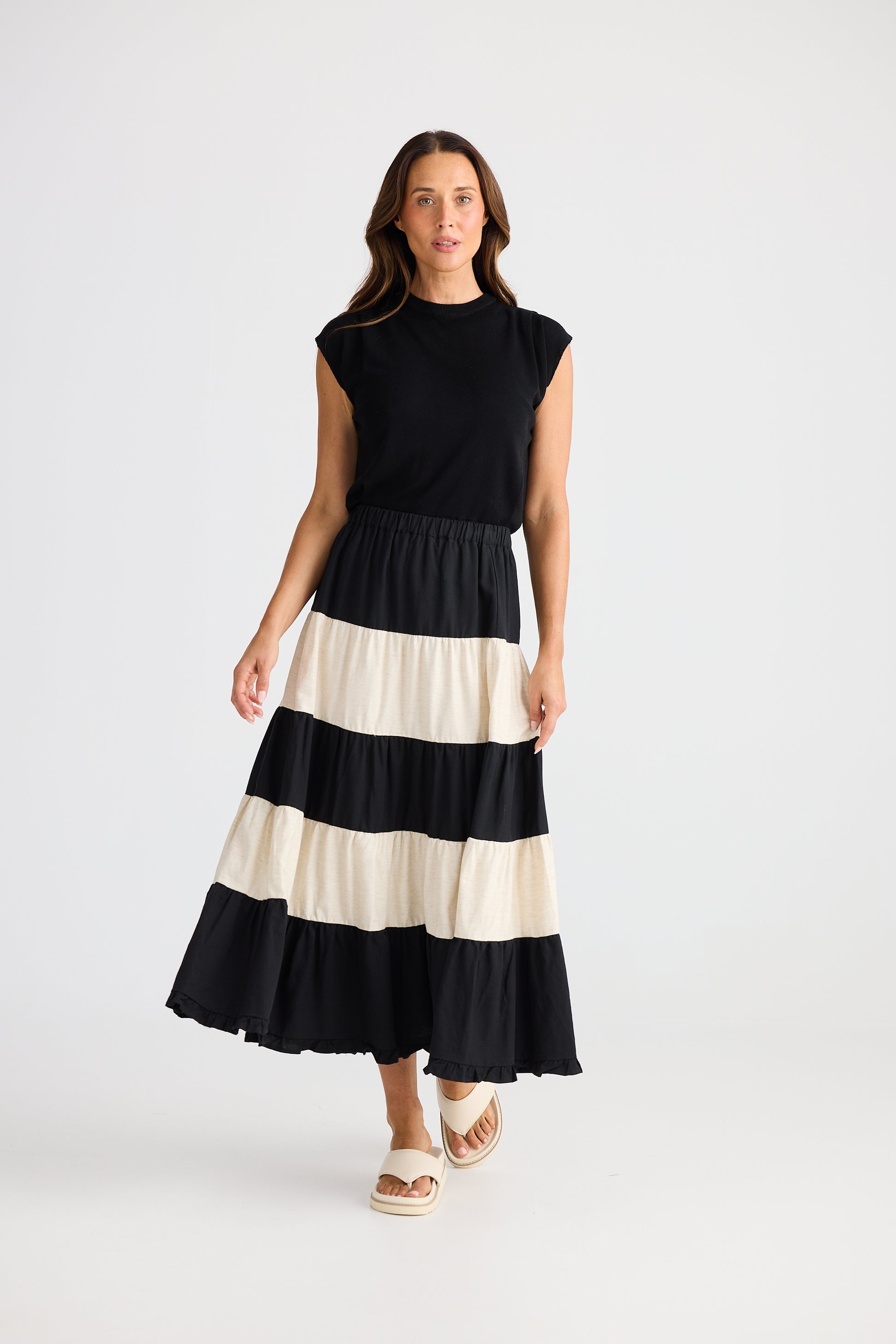 Step into effortless elegance with the Wonderland Skirt in Black with Natural by Brave + True. This full-length, tiered skirt is designed in a classic fit-and-flare silhouette that moves beautifully with every step. The soft, elasticated waistband ensures all-day comfort, while the gathered tiered panels add a touch of volume and texture. With its timeless black base and natural-toned detailing, this versatile piece can be dressed up or down with ease.